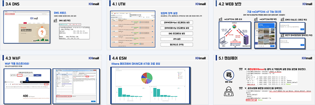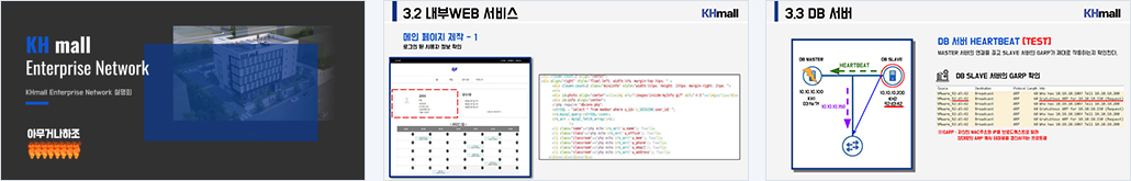 | 개요 | 목표 - 타사 홈쇼핑 업체에서 네트워크 구성 당시 비용 절감을 위해 최소한의 보안솔루션을 요구한 결과 WEB서비스쪽의 취약점으로 대규모 고객 정보 유출 사태가 있었다. 'KHMALL'은 '아무거나하조' 팀에게 네트워크망을 구축을 요청하였으며, 타사의 사례를 교훈 삼아 특별히 WEB서비스쪽의 보안이 강화된 네트워크망을 요청하였다. 이에 따라 '아무거나하조' 팀은 네트워크 구축 및 모의해킹을 통한 취약점 분석 후 안정적인 네트워크 서비스 및 보안 솔루션을 제공하기로 하였다. 수행 범위 ㆍ네트워크 - 외부 쇼핑몰 이용자를 위하여 가용성에 중점을 둔 네트워크망 구축 및 내부 직원용 네트워크망 구축, 재택근무직원을 위한 VPN설치 ㆍ서버 - DMZ서버의 WEB, DNS서버 구축과 내부 네트워크에 WEB, DNS서버 구축 및 DB서버 설치 ㆍ보안 - 내부 네트워크망은 최소한의 보안 사용, WEB서비스와 관련된 망은 WAF, UTM, ESM 보안솔루션을 통한 WEB 보안 구축 |