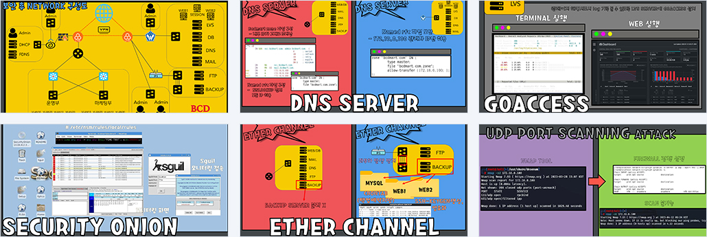사용 기술 : OSPF, NAT, DNS, DHCP, MAIL, MYSQL, FTP, HTTP, HTML, PHP, SSL, SSH, ACL, LVS, RAID, CRONTAB, SQUIRREL MAIL, REDIS, ARPTABLES, IPVSADM, VPN, VLAN, VRRP(G/W 이중화), IPS, Firewall, ZEBRA, QUAGGA, SNORT, PYTHON3, Security Onion RSYNC, SSH-KEYGE, ETHER CHANNEL, PVST, PAM, GoAccess 개발 환경 : GNS3, VMWARE, VirtualBox, WAF, UTM, Window7, WinXP, Linux CentOS, Kali, VScode, WorkBench |