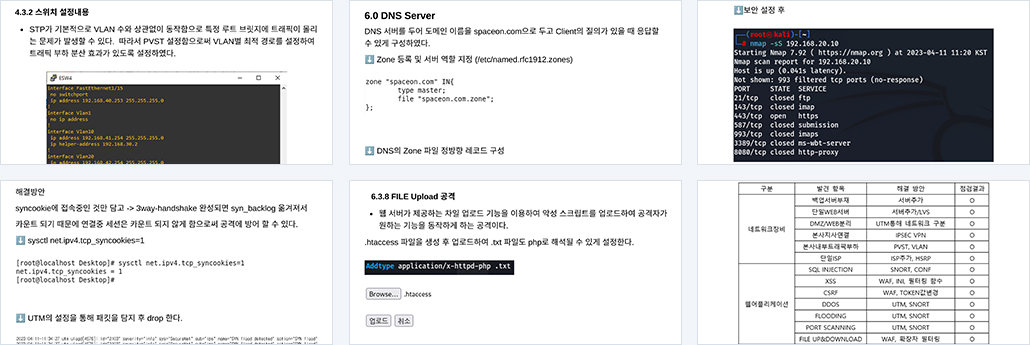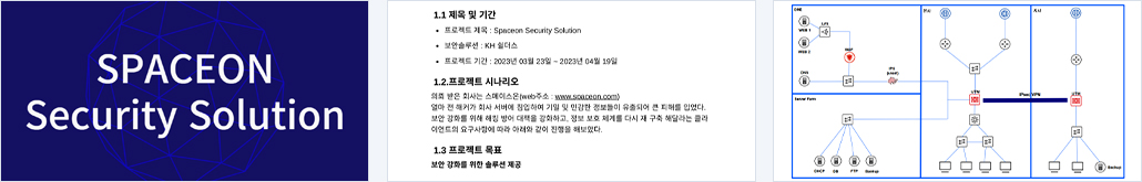 | 개요 | SPACEON 회사는 얼마 전 해커가 회사 서버에 침입하여 기밀 및 민감한 정보가 유출되어 큰 피해를 입었다. 보안 강화를 위해 해킹 방어 대책을 강화하고, 정보 보호 체계를 다시 재 구축 해달라는 클라이언트의 요구사항에 따라 진행해보았다. |