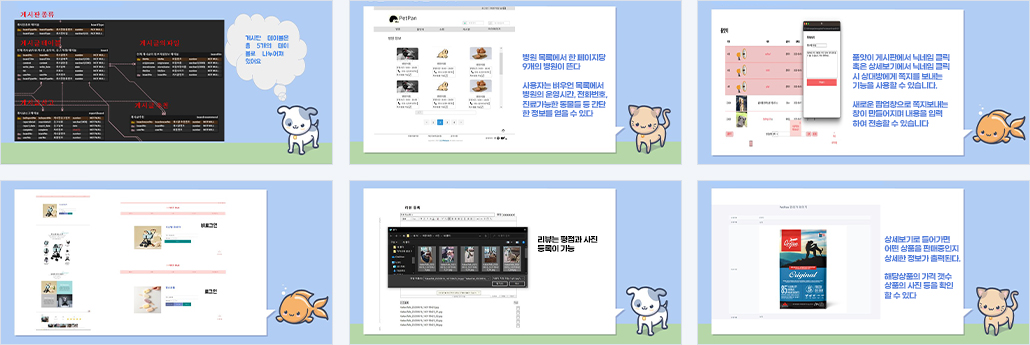| 구현기능 | ================================회원 페이지======================================== - 회원서비스 : 로그인, 소셜로그인, 마이페이지, 회원가입, 정보수정, 병원등록, 펫정보등록 ,회원탈퇴 - 쇼핑 : 쇼핑리스트, 쇼핑검색, 장바구니, 결제, 구매내역, 리뷰작성, 상품신고 - 쪽지 : 쪽지보내기, 쪽지보기, 쪽지저장, 읽음처리, 받은지 30일이 지난 쪽지는 자동삭제, 관리자를 제외한 모든 유저에게 전체쪽지보내기 - 공지사항 : 공지사항 조회 - 게시판 : (종류) 자유게시판, 중고거래, 품앗이 게시글쓰기, 게시글조회, 거리별 게시판 리스트 띄우기, 게시글수정, 게시글삭제, 댓글, 대댓글(깊이제한없음) 쓰기 / 삭제 / 추천, 게시글추천 - 병원 : 병원 등록(파일 업로드), 병원 목록, 병원 검색(반경), 사용자와 병원 사이 거리, 좌표 기반 지도 api ================================관리자 페이지======================================== - 관리자메인페이지 : 링크별 헤더수정, 메인페이지 관리 - 상품관리 : 상품목록보기, 상품등록, 상품수정, 상품판매중단 및 재개, 신고상품관리, 불량신고자처리, 선택신고상품처리, 개별신고상품처리, 신고처리 상품 처리완료 표시, 구매자관리, 선택 구매자 구매완료처리, 구매완료 처리시 물품갯수처리 및 수정 - 신고관리 : 게시글신고조회, 신고게시글 삭제, 신고댓글수정, 불량신고자&피신고자처리, 게시글신고 처리완료표시, 댓글 신고 처리완료 표시 - 유저관리 : 유저조회, 유저검색, 유저수정 - 블랙리스트 관리 : 블랙리스트조회, 블랙리스트 추가, 블랙리스트 중복제거, 블랙리스트 선택해제, 블랙리스트 개별해제 - 공지 관리 : 공지조회, 공지작성, 공지수정, 공지삭제 |