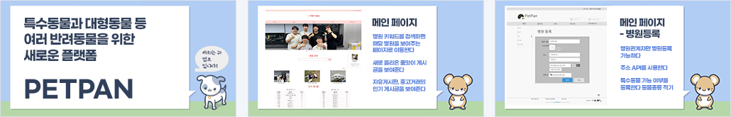 | 설계의 주안점 | - 다양한 SNS를 통한 로그인 시스템 - 특수동물 병원 위치 정보 제공 - 품앗이를 위한 거리별 게시글 띄우기 - 가까운 병원 위치와 진료가능 여부 제공 |