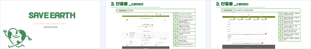 | 개요 | 우리나라 1인당 플라스틱 쓰레기 배출량이 세계에서 상위권 이라고 한다. 이를 통해 미래에도 지속 가능한 지구를 꿈꾸는 웹사이트 기획하고 싶었다. 환경에 관련된 캠페인과, 챌린지를 알려주고 환경을 보존하는 정보를 서로 공유하고 질문을 통해 알아가며, 자신이 참여한 챌린지와 캠페인을 기록하는 커뮤니티를 제공한다. |