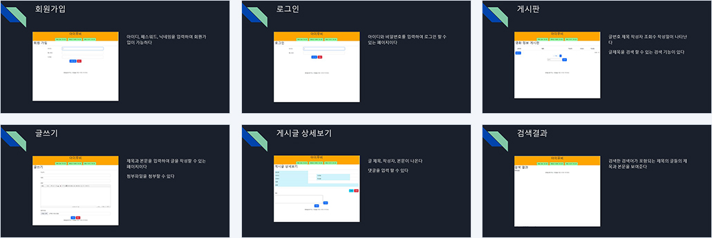 | 구현기능 | 회원서비스 : 로그인, 로그아웃 게시물 : 작성, 수정, 삭제, 검색, 댓글 |