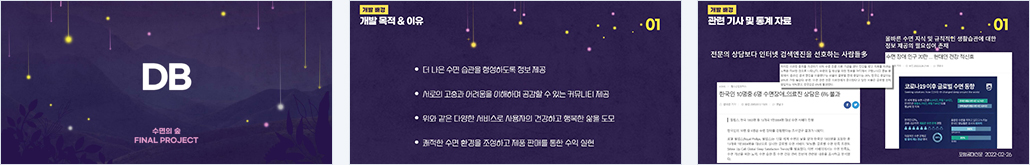 | 개요 | 수면 장애를 겪는 사람들을 위한 전문 쇼핑몰 입니다. 저희는 수면과 관련된 다양한 상품을 판매하며, 동시에 회원들이 수면에 관한 유익한 정보를 공유하고 자유롭게 소통할 수 있는 커뮤니티 공간을 제공합니다. 저희 쇼핑몰은 사용자들이 원하는 상품에 쉽게 접근할 수 있도록 구성되어 있으며, 커뮤니티에 특화된 UI를 제공함으로써 기존 타사이트 커뮤니티 기능의 한계를 보완했습니다. 특히 커뮤니티에 일반 광고가 아닌 우리 쇼핑몰의 광고를 보이게 해서 수익을 극대화 할 수 있습니다. 또한, 단순히 피드백을 받고 문제를 해결하는 것이 아니라 문의 게시판을 통해 적극적으로 이용자의 질문에 답변하며 이용자 친화적인 사이트를 목표로 구현했습니다. 이처럼 다양한 서비스로 사용자의 건강하고 행복한 삶을 도모하고자 합니다. |