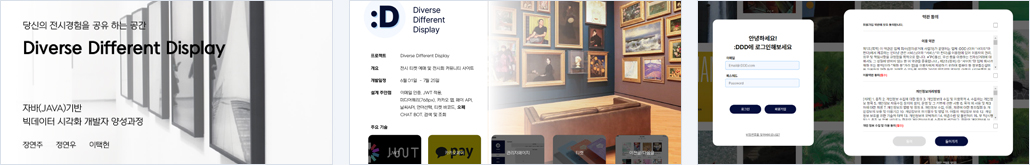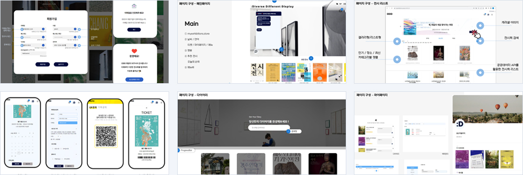 | 개요 | 다양한 분야의 전시 정보와 편리한 결제 서비스 이용이 가능하며, 다이어리를 통해 나만의 기록을 소장할 수 있는 공간 마련 및 회원들간에 정보를 공유할 수 있는 커뮤니티 제공을 담은 전시 사이트 |