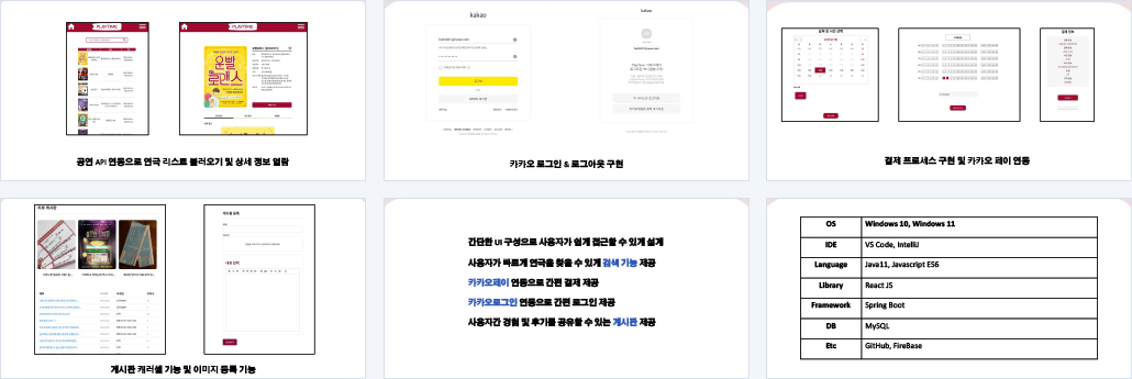 | 설계의 주안점 | - 반응형 웹으로 PC/모바일 환경에 최적화 된 UI 제공 - 최대한 간단하게 UI를 구성해 사용자가 보기 편한 UI제공 - 검색을 통해 사용자가 찾고 싶은 연극 제공 - 카카오페이 결제 연동으로 간편하게 결제할 수 있는 서비스 제공 - 리뷰 게시판을 통해 사용자에게 유용한 리뷰 정보 제공 |