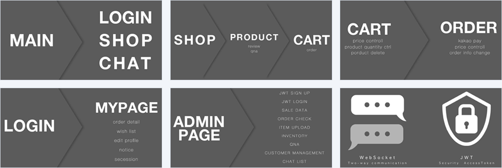 | 구현기능 | ✔ 메인페이지 - 사이드바 메뉴 - 채팅창 ✔ 샵 - 카테고리별 상품목록 ✔ 카트 - 사용자 별 장바구니 상품리스트 ✔ 마이페이지 - 회원정보출력 - 회원정보수정 - 찜목록 - 회원탈퇴 - 공지사항 - 주문내역조회 ✔ 관리자 페이지 - 배송 조회 - 매출 조회 - 총 주문 건수 / 주문 상태/ 택배 회사/ 송장 수정 - 상품 업로드 / 상품 재고 수량/ 판매 여부/ 이미지/ 상세설명 수정 - 고객 관리 - Qna 질문 확인 / 답변 등록 - 채팅 관리 / 채팅 답변(예정) ✔로그인 페이지 - 회원 조회 / 정보 없을 시 팝업 - 로그인 한 회원 이름. 이메일, 핸드폰 번호 conText Api 저장 주문 페이지에 저장 ✔ 회원가입 - 이메일인증 - 주소찾기 ✔ FAQ - FAQ 추가 - FAQ 수정 - FAQ 삭제 ✔ Q&A |