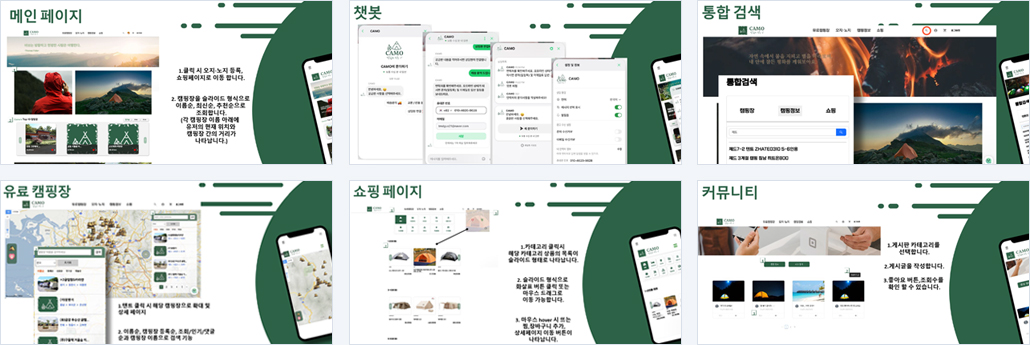 | 개요 | 전국 캠핑장 정보를 확인하고 캠핑 용품을 구매할 수 있는 사이트 |