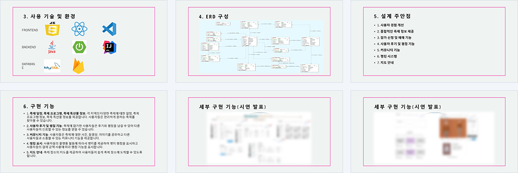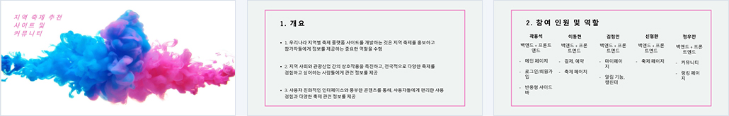 | 개요 | 1. 우리나라 지역별 축제 플랫폼 사이트를 개발하는 것은 지역 축제를 홍보하고 참가자들에게 정보를 제공하는 중요한 역할을 수행 2. 지역 사회와 관광산업 간의 상호작용을 촉진하고, 전국적으로 다양한 축제를 경험하고 싶어하는 사람들에게 관련 정보를 제공 3. 사용자 친화적인 인터페이스와 풍부한 콘텐츠를 통해, 사용자들에게 편리한 사용 경험과 다양한 축제 관련 정보를 제공 |