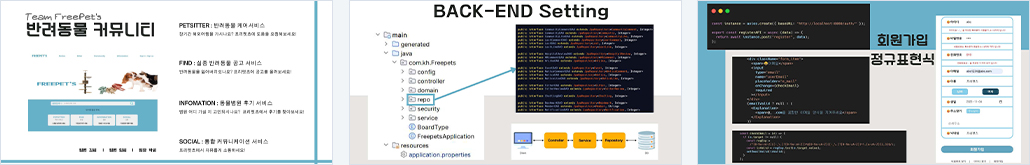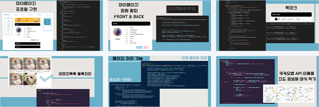| 구현기능 | 멤버 - 로그인, 로그아웃 - 회원가입 - 정보수정 - 마이페이지 (공통) 게시판 - 북마크 (등록, 삭제) - 알림 - 댓글 및 대댓글 공지사항 - 좋아요 - 게시글 정렬 및 검색 - 날씨 정보 API 호출 시터 - 별점 - 정렬 및 검색 병원 정보 - 카카오 맵 API 호출 - 좋아요 - 게시글 정렬 및 검색 분실신고 - 정렬 및 검색 - 좋아요 자유 게시판 - 정렬 및 검색 기능 - 좋아요 - 게시판 타입 변환 기능 |