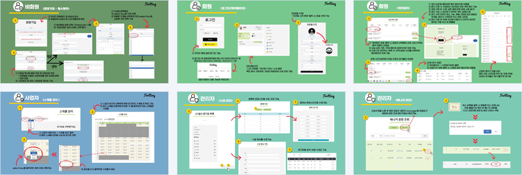 | 구현기능 | -회원 : 로그인, 개인매칭(매칭검색,조회,신청,취소), 클럽매칭(매칭검색,조회,신청,취소), 시설(시설검색,조회,경기장 검색,경기장조회), 클럽(생성,검색,조회), 커뮤니티(공지,자유,개인,클럽,문의 게시판/검색,조회,댓글,대댓글,차단,글쓰기), 신청(매니저신청,사업자신청), 마이페이지(프로필조회,프로필수정,내포인트조회/충전,내티어조회, 소속클럽 조회, 신청경기 검색/조회, 나의 전적 검색/조회, 회원찾기 검색/조회, 즐겨찾기 검색/조회/취소, 유저가 차단한 회원 검색/조회/취소, 나의쿠폰 조회,환급계좌등록,포인트내역 필터/조회, 포인트환급 조회), 로그아웃 -비회원 : 회원가입, 시설조회 -매니저 : (매니저로)로그인, 매니저전용(매치지역필터조회/신청(3주뒤)), 매니저 일정관리 -사업자 : (사업자로)로그인, 사업자전용( -관리자 : (관리자로)로그인, 회원관리(회원 검색/조회), 신고관리(커뮤니티신고 검색/조회/상세보기/제재(경고1회)/확인 매치신고 검색/조회/상세보기/제재(경고1회)/확인), 시설조회(전체,이용가능 필터로 검색/조회/삭제, 삭제 검색/조회), 매니저관리(신청관리 검색/조회/권한수정, 권한조회 검색/조회/권한수정&신청서삭제), 사업자관리(신청관리 검색/조회/권한수정, 권한조회 검색/조회/권한수정&신청서삭제 사업자입력 검색/조회/수정/삭제/사업자등록), 포인트환급관리(포인트 환급관리 검색/조회/환급 승인), 이용가격수정관리(평일개인,주말개인,평일클럽,주말클럽,변경적용일(최소3주뒤적용)) |
