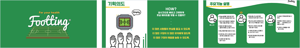 | 개요 | 개발의도 - 실시간으로 빠르고 간편하게 풋살 메이트 찾기 - 더 많은 사람들이 풋살을 즐길 수 있도록 더 많은 구장이 더 많은 유저에게 닿도록 더 많은 구장이 매출을 늘릴 수 있도록. |