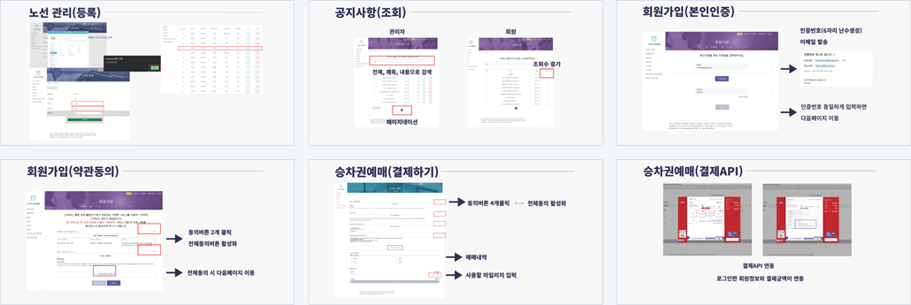 | 구현기능 | 관리자 - 고속사 관리 - 고속버스 관리 - 터미널 관리 - 노선 관리 - 운행 관리 - 공지사항 관리 예매 - 터미널, 날짜, 등급 선택을 통한 운행 조회 후 승차권 예매 - 운행 조회 시 조건에 맞는 운행정보 표시 후 예매 서비스 이용 가능 - 예매를 통해 적립된 마일리지 사용 가능 마이페이지 - 회원탈퇴 - 비밀번호 변경 - 전화번호 변경 회원가입 - 이메일 인증으로 회원가입 가능 |