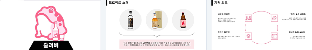 | 설계의 주안점 | 우리 전통주를 편리한 UI/UX를 제공하여 쉬운 학습성과 가시성으로 구매하기 원하는 전통주를 손쉽게 구입 / 배송받을 수 있는 웹서비스 제공을 목표합니다! |