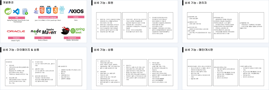 | 구현기능 | 회원 - 회원가입 / 로그인 - 아이디 찾기 / 비밀번호찾기 - 마이페이지(개인정보 수정) - 회원탈퇴 관리자 - 회원 목록 조회 - 상품 재고 관리 - 성인 인증 관리 - 주문 배송 관리 - 매출 현황 조회 마이페이지 - 주문 내역 - 관심상품 조회 - 1:1 문의 - 상품 후기 - 성인인증 요청 상품 - 상품 상세페이지 - 상품 목록 조회 - 상품 등록 - 장바구니 - 주문 및 결제 게시판 -공지사항 / 1:1문의 |