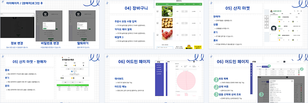 | 구현기능 | 회원 기능: - 가입 (구매자 / 판매자), 로그인 / 로그아웃 - 아이디 / 비밀번호 찾기, 회원정보 수정 / 탈퇴 상품 관리: - 상품 조회 / 검색 / 상세정보 - 상품 주문, 댓글 및 좋아요 기능 주문 및 결제: - 주문 내역 조회, 장바구니 관리 - 카카오페이 API를 활용한 결제 시스템 게시판 및 커뮤니케이션: 마켓 문의 및 댓글 - 후기 게시판, 댓글 기능 - 홍보 게시판, 댓글 기능 마이페이지 및 판매자 도구: - 마이페이지 (회원정보, 구매목록, 문의글) - 판매자용 마켓 개설 및 관리 - 통계 조회, 찜한 유저 조회 관리자 기능: - 공지사항 관리, 회원 관리 - 마켓 / 상품 / 판매목록 / 통계 조회 |