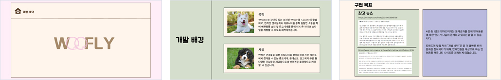 | 개요 | Woofly는 강아지의 짖는 영어 발음 woof와 lovely를 합친 단어로, 애완용품 쇼핑몰 및 반려인들을 위한 위치기반 커뮤니티 사이트입니다. |