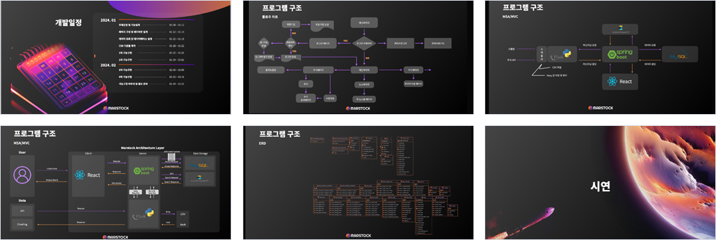 | 개요 | - 프로젝트 기간 : 2024.01.22 ~ 2024.02.21 - 프로젝트명 : MARSTOCK - 기획 배경 : 주식 분석 및 모의투자 - 기대 효과 : 주식데이터를 취합하여 얻은 정보로 분야별 주식 성장세 등 동향 파악을 수월하게 하며 모의투자기능으로 주식경험 증대 |
