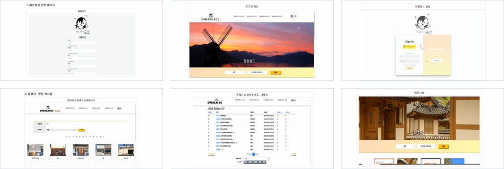 | 구현기능 | - 메인 - 회원 관리 : 회원가입, 로그인, 마이페이지 - 커뮤니티 게시판 : 작성, 수정, 삭제, 대댓글, 추천수, 조회수, 검색, 찜하기 기능 - 관광지, 맛집 리스트 및 상세페이지 : 페이징, 검색 기능 |