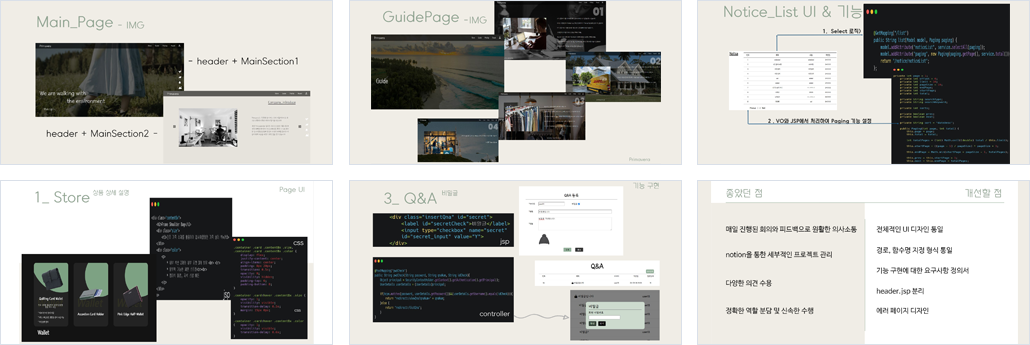 | 구현기능 | - 메인 & GUIDE - 회원관리 : 회원가입, 로그인, 카카오로그인 등 회원/관리자 페이지 - NOTICE : 공지사항 관련 기능 - PICK UP : 수거 신청 및 관리 기능 - Q&A : 사용자 질문 답변 기능, 비밀글 등 가능 - STORE : 제품 관련 기능 - REVIEW : 사용자 리뷰 관리 기능 |