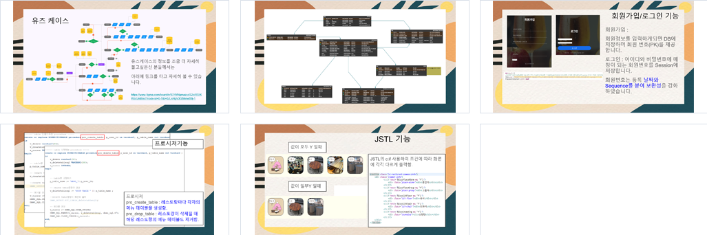 | 설계의 주안점 | - 로그인 유무에 따라 특정 페이지 진입 또는 이용 불가 - 메뉴판은 가게이름으로 된 테이블로 생성되며 수정 조회 가능하게 만듦 - 연계된 db를 파악하고 개인정보 일부를 삭제할때 순차적으로 삭제가 가능하게 만듦 - 로그인 후 로그인이 유지 가능하게 만듦 -- 레스토랑 오너 계정 -- 메뉴 추가 - 거의 완성됐는데 db에 오류 -??? 디버깅해서 마무리 합시다. -- 메뉴 수정 -- 메뉴 삭제 --- 레스토랑 삭제 --- 일반계정 레스토랑 찾기 - 이미지가 없어요.. 이미지 좀 넣고 스크린 샷 찍으면 좋을 것 같은데.... -- 여기가 딱.. 기능은 있는데.. 이미지 없어요. -- 다음 팀에서는 꼭 템플릿 씁시다. 꼼꼼쟁이 crud 이지만.. 그렇게 안보이죠. 방문하기- 시간이 5시간만 더 있으면 .... |