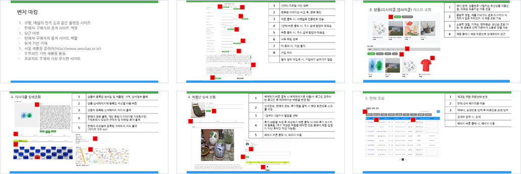 | 개요 | 지구온난화로 환경문제가 심각해지는 가운데 생활 속에서 재활용품을 활용해 다시 사용할 수 있는 새활용 제품을 만드는 사람들을 알게되고 서로의 이득에 맞게 재활용품과 새활용제품을 거래해서 환경에 기여하고 재활용품을 팔고 싶어 사람과 사고싶어 하는 사람, 재활용품을 이용해 새활용품을 만들어 팔고 싶은 사람과 사고 싶은 사람을 중계해주는 서비스를 제공한다. 추가로 재활용품 활용 방안을 체험단을 통해 체험해 볼 수 있는데, 체험단을 제공하고 싶은 사람/기업과 체험하고 싶은 사람을 중계한다. |