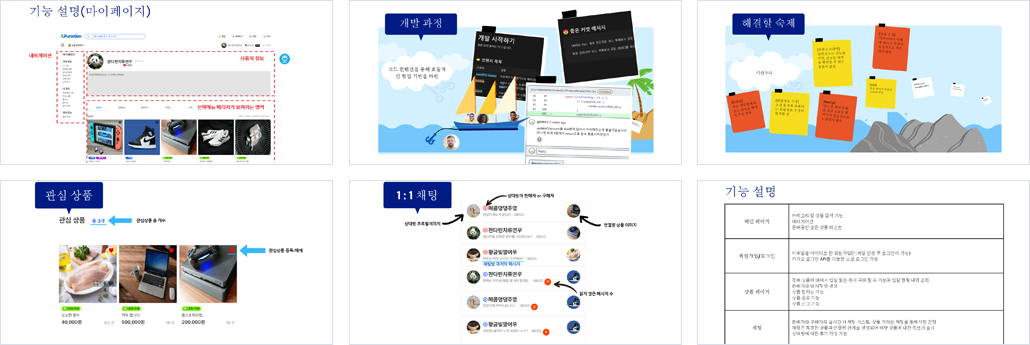 | 설계의 주안점 | 벤치마킹 서비스와 비슷한 익숙하고 친화적인 UI 소셜 로그인/회원가입을 통해 사용자 편의성 제공 경매시스템을 이용한 판매 방식 제공 경매상품 입찰시 다양한 상황 고려 서버 스케쥴러를 이용한 실시간 낙찰 시스템 구현 입/낙찰 관련 다양한 상황에 대한 실시간 알림 제공 양방향 1:1채팅을 통한 상품 거래 진행 직거래 사기 예방을 위한 안전결제 시스템 제공 |