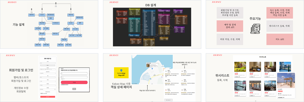 | 구현기능 | 나지원 - (회원) 예약, 결제, 리뷰 - (호스트) 예약 목록조회, 취소기능 주선기 - (호스트) 객실 관리 - (회원/호스트) 회원가입, 로그인, 탈퇴 이지수 - (호스트) 숙소 관리 - (회원) 위시리스트 |