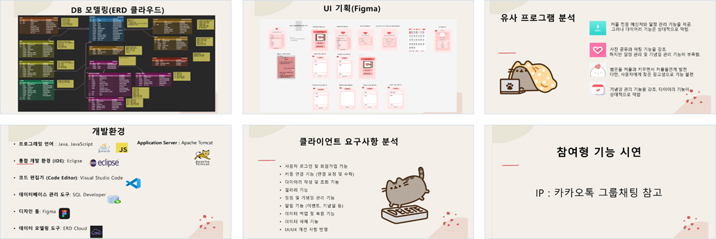 | 설계의 주안점 | *커플만 접근할 수 있는 보안 기능 *커플이 필요로 하는 다양한 기능 구현 *개인정보 보호를 위한 테이터 복원 및 삭제 *새로운 기능 추가 가능 *캘린더 기능을 이용한 사용자 직관적 UI설계 |