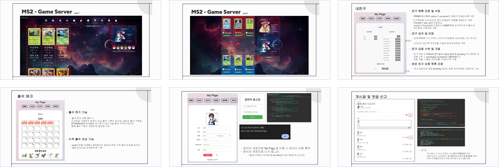 | 설계의 주안점 | - 가볍게 할 수 있는 게임 - 이벤트와 서비스 참여로 즐길 수 있는 수집 컨텐츠 - AI로 느낄 수 있는 UX - 반응형과 CSS 애니메이션으로 다양한 UI - 유저들끼리 소통할 수 있는 커뮤니티와 쪽지 |