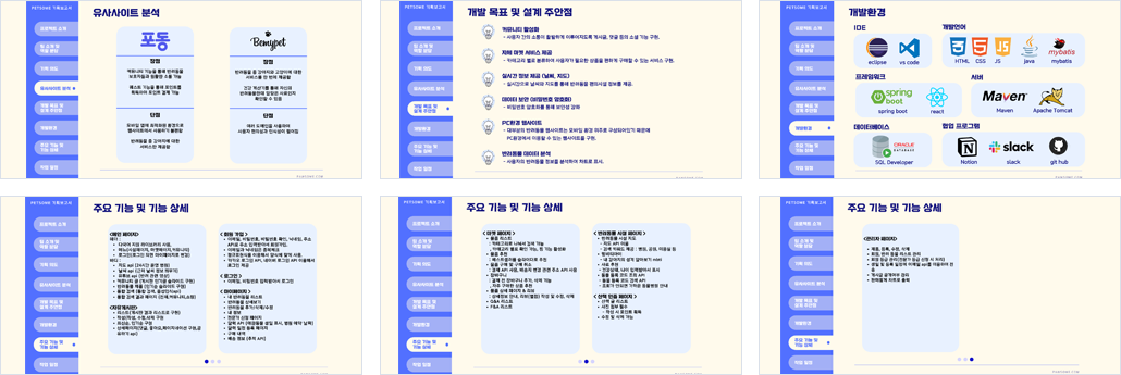 | 개요 | 우리 반려동물 플랫폼은 반려동물 보호자들을 위해 반려상품 구매, 커뮤니티, 산책 인증, 그리고 동물 병원 및 펫샵 등 시설 정보를 제공하는 종합 서비스를 제공합니다. 반려동물의 건강과 일상을 편리하게 관리할 수 있는 통합 플랫폼을 목표로 기획되었습니다. |