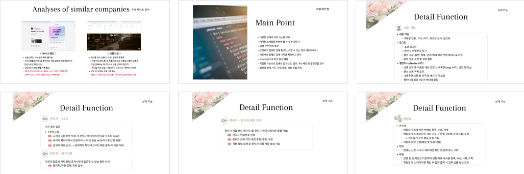 | 구현기능 | 회원기능 - 회원 가입 이메일 인증 , 주소 API , 유효성 검사, 암호화 - 로그인 소셜 로그인 아이디, 비밀번호 찾기 회원 구분(일반, 업체, 관리자)에 따라 전용 페이지로 이동 회원 정보 수정 및 회원 탈퇴 - 캘린더(calender API) 상품 상담 및 이용일 대한 일정 상세 확인(map API), 변경 및 취소 관심 상품 목록 조회 이용중인 상품 총 견적 및 예상 견적 조회 캘린더의 일정 n일 전 헤더에 알림 상품 전체/상세 페이지 - 최신 또는 인기 순으로 상품을 볼 수 있게 제공 - 웨딩홀 검색 시/도 또는 해시태그로 검색 - 원하는 상품 찜하기 - 상품 이용 결제 / 상담 예약 - 회원으로 로그인 후 불량업체에 신고하기 - 평점/ 상품 후기 작성, 수정, 삭제 - 달력 API 기능 구현하여 이용일 선택 후 결제/예약 프로세스 - 결제 시 회원 정보 자동 입력 및 페이 API - 웨딩홀의 위치 제공 (map API) 업체 사용자 관리 기능 - 업체코드를 발급받은 후 업체페이지 이동 - 업체 정보 등록, 수정, 조회(이미지 활용) - 동일한 업체코드로 직원 회원가입 - 상품 등록, 수정, 삭제(이미지 활용) - 박람회 상품 조회, 수정, 삭제 업체 고객관리 기능 - 업체별 이용중인 고객 정보 조회 - 업체별 상담 요청 조회 - 업체별 상담 완료 후 진행 내용 및 상태 전체 조회 - 결제 완료한 고객 진행 내용 및 상태 전체 조회 관리자 - 유저관리 전체회원조회 이름,아이디 등으로 특정회우너 조회 이름클릭 시 상세정보, 배우자 정보 조회 - 업체관리 업체코드, 업체명으로 특정 업체 조회 리스트 중 특정 업체 클릭하여 업체 상세정보, 사업자 상세 정보 확인 누적 신고 수 클릭하여 신고내역 상세조회 관리자 판단으로 업체 선택 삭제 매출 조회(월 별 매출액, 총 매출액, 판매사상품 별 수익) - 광고 신청된 광고 수락/거절 진행예정광고의 조기시작 진행중과고 조기종료 종료된 광고 - 자주묻는 질문 1:1 문의 사항 - 공지사항 회원 등급에 따라 관련 공지사항에 접근 할 수 있는 권한 부여 - 관리자 권한 관리자 관리자 비밀번호 인증 관리자 권한 가진 계정 조회,열람,수정 기본 정보 입력 후 관리자 회원 계정 생성 박람회 - 관리자 박람회 주최에 따른 박람회 등록, 수정, 삭제 박람회 부스 레이아웃 관리 기능 구현 및 자리별 금액 등록, 수정(구매 불가 부스 별도 설정 가능) 박람회 참여 신청(회원 및 업체 대상) - 업체 업체는 신청 시 부스 레이아웃 확인 및 잔여 부스 구매 - 회원 진행 중 및 예정인 박람회에 관한 자유 게시글 등록, 수정, 삭제, 조회 확정된 부스 레이아웃 확인 후 업체 클릭 시 업체 상품 정보 조회 |
