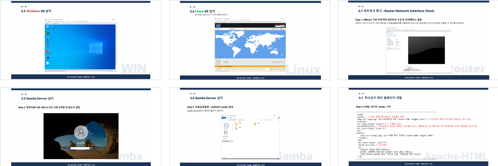 | 개요 | 본 프로젝트는 NAT 기능을 사용하여 NFS 를 중심으로 하는 교내 네트워크를 구축하는 것을 목표로 한다. Rocky Linux 기반의 Apache 웹 서버와 DNS를 활용하여 학교 홍보홈페이지를 구축한다. 웹사이트는 PHP로 구현되어 학교홍보페이지를 제공하며 정적 파일을 기반으로 정보를 업데이트한다. VMware 를 사용하여 리눅스와 윈도우를 구성하고 적절한 IP 주소, 라우터 설정 등으로 통신가능한 여러 네트워크를 구축하는 데에 집중한다. 또한 DNS와 APACHE 서버를 통해 인터넷 브라우저와 리눅스 서버가 연동되는 과정에 집중한다. NFS와 SAMBA 를 이용하는 리눅스 서버 구축으로 효율적인 네트워크를 구성하는 실습을 해본다. NFS 를 활용해 서버간 자원을 공유하는 실습도 진행하여 지금까지 학습한 내용을 정리하고 네트워크에 대한 이해를 확실히 한다. |