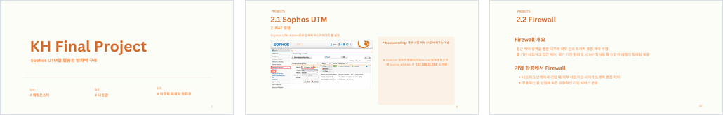 | 개요 | 최근 들어 원격근무의 일상화와 더불어, 사이버 위협이 갈수록 다양화됨에 따라 기업의 업무망을 보다 정밀하게 보호할 수 있는 네트워크 보안 체계의 필요성이 강조되고 있다. 본 프로젝트는 Sophos UTM이 제공하는 다양한 보안 기능 WAF(Web Application Firewall), ACL(Access Control List), IPS(Intrusion Prevention System), 웹 필터링(Web Filtering), VPN(Virtual Private Network)을 종합적으로 사용하여, 외부로부터의 비인가 접근을 효과적으로 차단하고 내부 자산에 대한 침해를 방지할 수 있는 종합 보안환경 구축을 목표로 한다. |