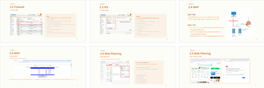 | 설계의 주안점 | 1. 보안구역을 분리하여 네트워크 설계 - 네트워크를 External, DMZ, Internal 세 영역으로 분리하여 보안 정책을 적용 - Internal, External → DMZ 접근 가능 - External → Internal 직접 접근 불가(VPN을 통한 접근만이 가능하도록 설정) - DMZ → Internal 직접 접근 불가 (웹 서버만이 Oracle 서버에 Oracle SQL*Net v2 접속 가능) 2. 실사용 환경 고려한 VPN 구축 - 원격근무가 필요한 환경에서 SSL VPN 기반의 안전한 원격접속 통로 마련 3. 실시간 위협 대응 기능 구현 - IPS 기능을 통해 이상 행위 및 실시간 공격 탐지 4. Sophos의 보안 기술의 통합 적용 - ACL, IPS, WAF, VPN, 웹 필터링 |