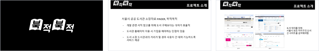 - 개발 관련 서적 참고를 위해 구매보다는 대여가 효율적이지만 도서고나 홈페이지 이용 시 가입을 해야한다는 단점이 있음 - 개발자를 위한 개발 도서 검색 서비스를 제공함으로서 한번의 검색으로 해당 도서의 정보와 도서를 소장 중인 서울 시내 도서관 목록을 조회 할 수 있으며 대출 가능 여부를 확인 할 수 있다. - 도서관을 이용하기 어렵거나 도서관에서 대출이 불가능한 경우 사용자의 경우 지역구 내 회원 간 대출을 위한 공간 구현. |