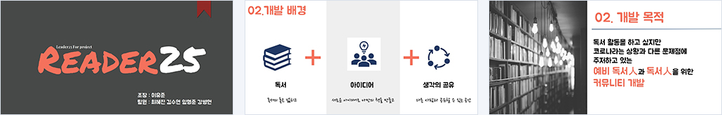 개요 코로나19의 여파로 밖에서 독서 모임, 독서 토론을 즐기지 못하는 사람들을 위해 웹적으로나마 독서의 즐거움, 토론의 즐거움을 느낄 수 있게 하고 싶다는 생각으로 인해 구현하게 되었습니다.