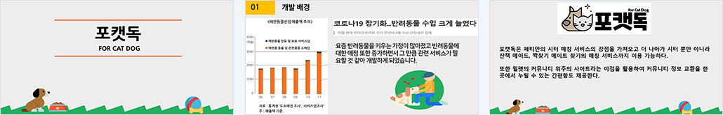개요 기본적으로 다양한 종류의 반려동물에 대한 정보를 제공하고 다양한 만남과 돌봄이 필요한 경우를 위해서 매칭 서비스를 제공하며 주변의 병원과 애견카페를 찾을 수 있는 기능과 반려동물의 물건을 팔고 나눌수도 있는 기능까지 추가함으로써 반려동물에 관심이 있는 사람들 모두가 접근할 수 있는 커뮤니티