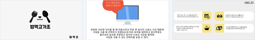 개요 한정된 시간에 식사를 할 때 이동시간과 주문 후 음식이 나오는 시간 때문에 식당을 고를 때 선택지가 한정되는데 미리 좌석을 예약하고 음식주문도 함으로써 음식을 주문하고 음식이 나오는 시간을 절약해 식당을 고를 수 있는 선택지를 늘릴 수 있다.