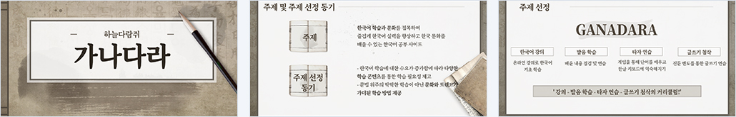 한국어 학습 희망자에게 문법위주의 딱딱한 학습 대신 한국문화와 트렌드가 가미된 즐거운 학습자료 및 방법을 제공한다. 이를 위해 온라인 강의, 단어/발음학습, 타자연습, 첨삭 기능 등을 구현하여 학습을 돕고 글로벌 환경에 맞춰 영어번역이 가능하도록 국제화 기능을 담아 사용의 편리성을 높인다. |