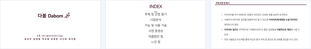 다이어트를 하기 위해서는 운동과 식단관리,건강한 생활 습관이 요구된다. 사용자가다이어트 관리를 효율적으로 할 수 있도록 도움을 주고자 다이어트에 특화된 SNS를 제작하고자 함. |