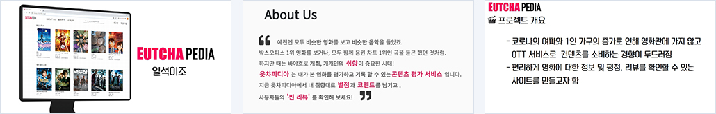 추천 및 평가되는 영황의 종류가 다양하게 노출될 수 있도록 구성하며, 추천 및 평가를 보다 쉽게 하게하고 조회할 수 있도록 설계 |
