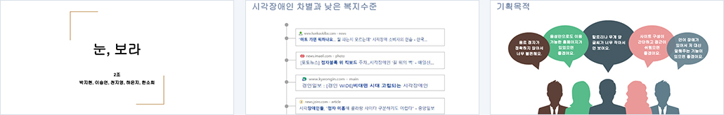 시각 장애인 및 언어 장애인의 불편 해소를 목적으로 설계 하였으며, 웹을 사용할 때 이들이 어떤 불편을 겪는지 파악 하여 문제점을 최소화 하는 것에 초점을 두었다.