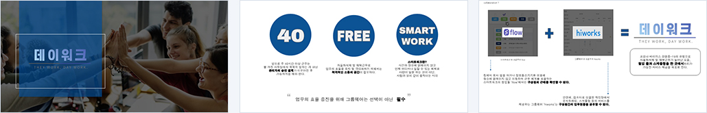 코로나 시대에 재택근무에 발맞춰 업무협업이 중요한 시기에 최적화한 DAY WORK 그룹웨어입니다. 자신의 업무 일정과 팀 업무 스케줄을 공유하는 `스케줄러`와 한눈에 업무 흐름을 파악할 수 있는 `업무협업 도구`로 소통이 원활합니다. 또 자유롭고 수평적인 의사소통으로 `사내 게시판`에서 정보를 공유하며 이메일의 단점을 보완하여 형식보다 중요한 내용만 간결하게 전달하는 `메시지`와 외부방해 요인 없이 빠르게 의견이 교환이 필요할 때 `채팅`으로 소통합니다. 필요한 기능만 간결하게 있는 `결재기능`을 외부에서도 결재를 올리고 비대면으로 승인을 받습니다. 또 쉽고 편리한 `설문조사`로 모두를 위한 합리적인 의사결정을 합니다. 사내 연락처와 사외연락처를 저장해 쉽게 검색하는 `주소록` 기능도 있습니다. 같은 공간에 있지 않아도 같은 공간에 있는 것처럼 사용하는 그룹웨어를 만들고자 했습니다. |