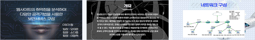A 기업이 다양한 공격에 대응할 수 있도록 보안 점검해달라는 의뢰를 했다. 기업의 WEB, DB, DNS 서버를 각각 구성한다. XSS, SQL Injection, Scanning 공격 기법을 시도하여 취약점을 발견 후 분석한다. 이를 통해 발견된 취약점에 대한 대응 방안을 모색하고, 위의 공격에 대응할 수 있는 보안 서비스를 구축한다. |