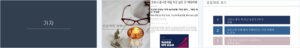 프로젝트 기획 배경 뉴스를 찾아보니 코로나 종식 이후 사람들이 하고 싶었던 순위 1위가 여행이었고, 코로나로 인해 해외여행보다는 국내 여행에 더 관심이 있다는 정보를 얻게 되어 국내 여행과 축제, 레포츠 정보를 추천해주는 사이트를 만들어보면 어떨까 라는 생각을 해보았고 공공데이터를 응용하기 알맞은 것이 무엇이 있는지 팀원들과 회의를 통한 결과 여행이 가장 어울릴 것 같아 프로젝트 주제로 선정