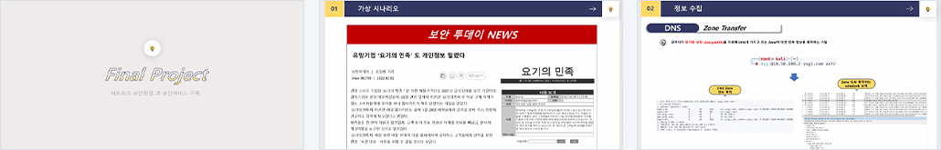 네트워크 - VLAN, NAT, Load Balancing, VPN, VRRP 서버 - Director Server, Web1/2, DB, DB backup, DNS, DHCP 보안 - IPTABLES, WAF, UTM, IDS |