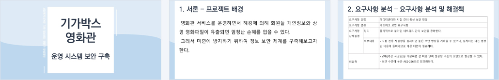 프로젝트 배경 영화관 서비스를 운영하면서 회원들 개인정보뿐만 아니라 상영 영화파일이 유출되면 엄청난 손해를 유발시킬 수 있다. 그래서 미연에 방지하고자 기가박스 영화관 정보 보안 체계를 구축해보고자한다.