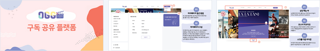 | 개요 | OTT 구독 공유 플랫폼 "OGG" - 넷플릭스, 티빙 등 콘텐츠 뿐만 아니라 오피스 프로그램 등 다양해진 OTT 서비스로 인해 부담해야 할 비용이 늘어나 고민인 사용자, 구독공유를 공유할 사람을 모으기 어려운 사용자들에게 합리적인 소비를 제공하기 위해 구독 공유 플랫폼을 기획하게 되었습니다. - 단순히 구독 공유만을 운영하기 보다 다양한 컨텐츠의 정보를 제공해주고 다른 사람들의 리뷰도 확인 할 수 있는 공간도 준비했습니다. - 또한 컨텐츠를 좋아하는 사람들, 다양한 취향을 가진 사람들과 함께 여러 소재로 소통할 수 있는 커뮤니티 게시판도 제공 할 수 있도록 기획 했습니다. |