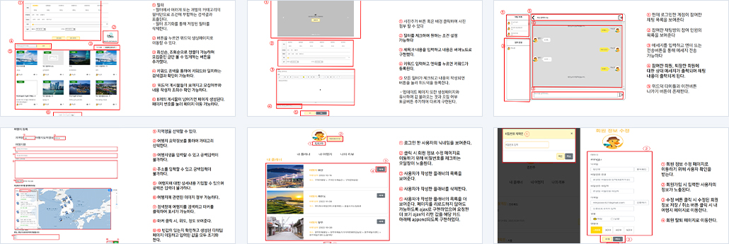 | 김** : - 마이페이지 (내 플래너, 내 여행지, 나의 리뷰) : 더보기, 플래너 삭제, 여행지 좋아요 해제, 리뷰 수정 및 삭제 - 회원 수정 페이지 - 회원 탈퇴 페이지 - 발표 음성 녹음 |